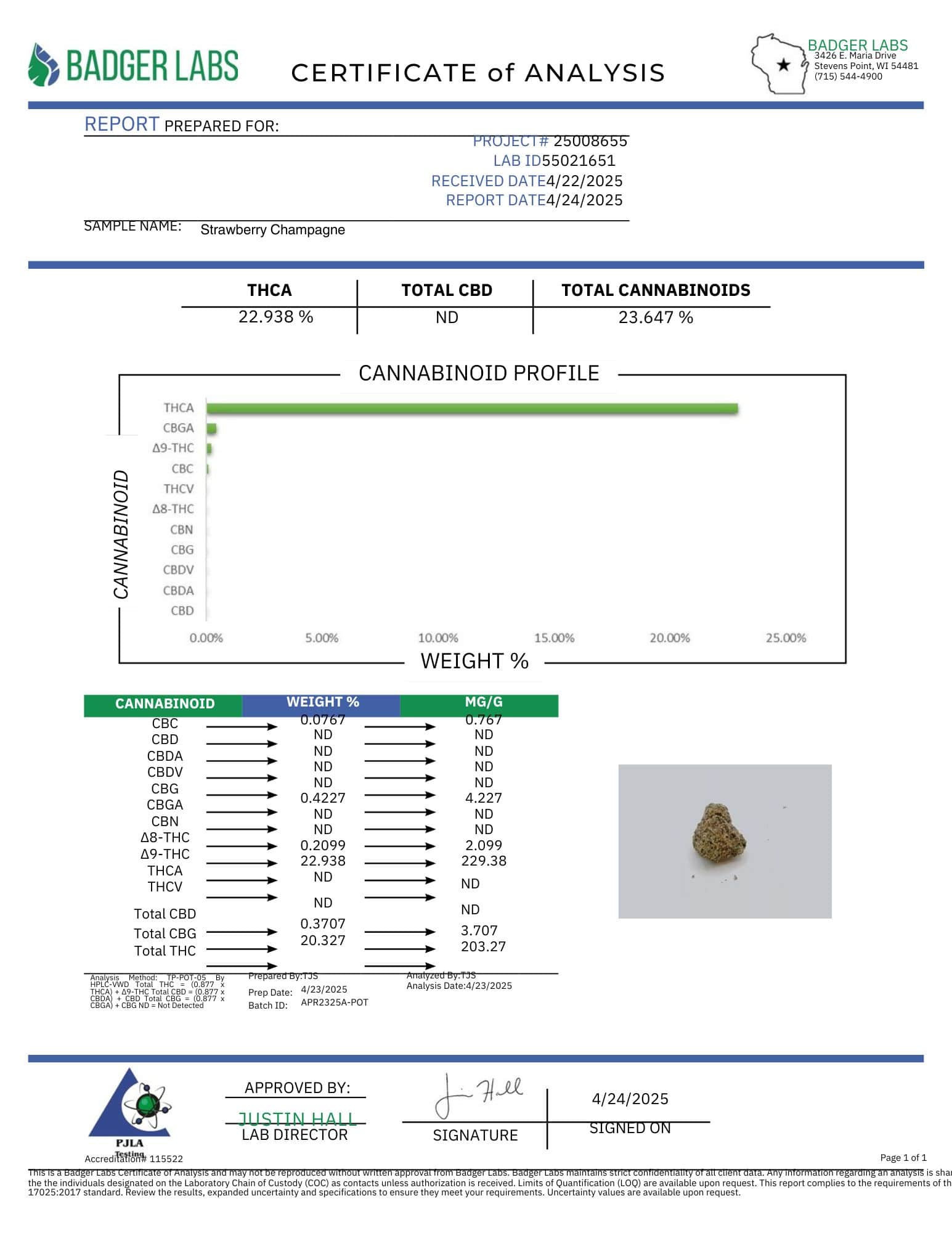 The flavor lives up to its name, delivering notes of ripe strawberry and sparkling champagne with subtle earthy undertones. Its aroma is equally enticing—sweet, fruity, and slightly floral—making it a pleasure to both smell and smoke. The dominant terpene, myrcene, contributes to the strain’s calming, anti-inflammatory properties while enhancing its relaxing qualities.